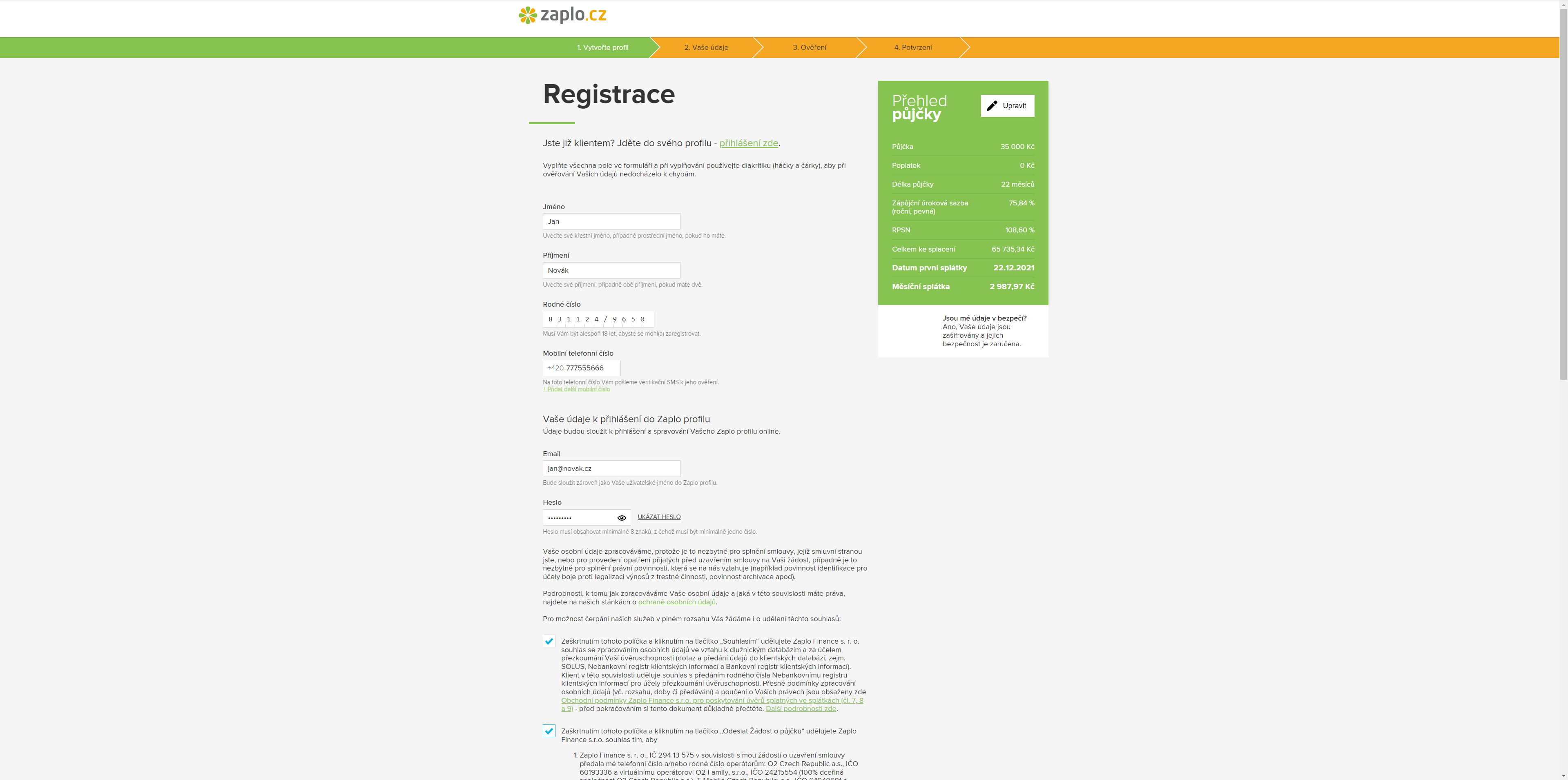 Následně dojde k založení vašeho osobního profilu a bude nutné vyplnit zbytek formuláře, v němž o sobě prozradíte pár informací (kde a jak dlouho pracujete, jaké máte příjmy, kde bydlíte apod.), aby mohlo Zaplo vyhodnotit vaši životní a finanční situaci.